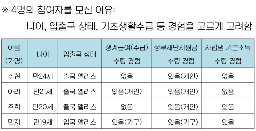 ![]() ▲ 탈가정 후기청소년 긴급재난지원금 지급 사업을 평가하는 집단 인터뷰에 참여한 앨리스들의 기본 정보. ©청소년자립팸 이상한나라 |