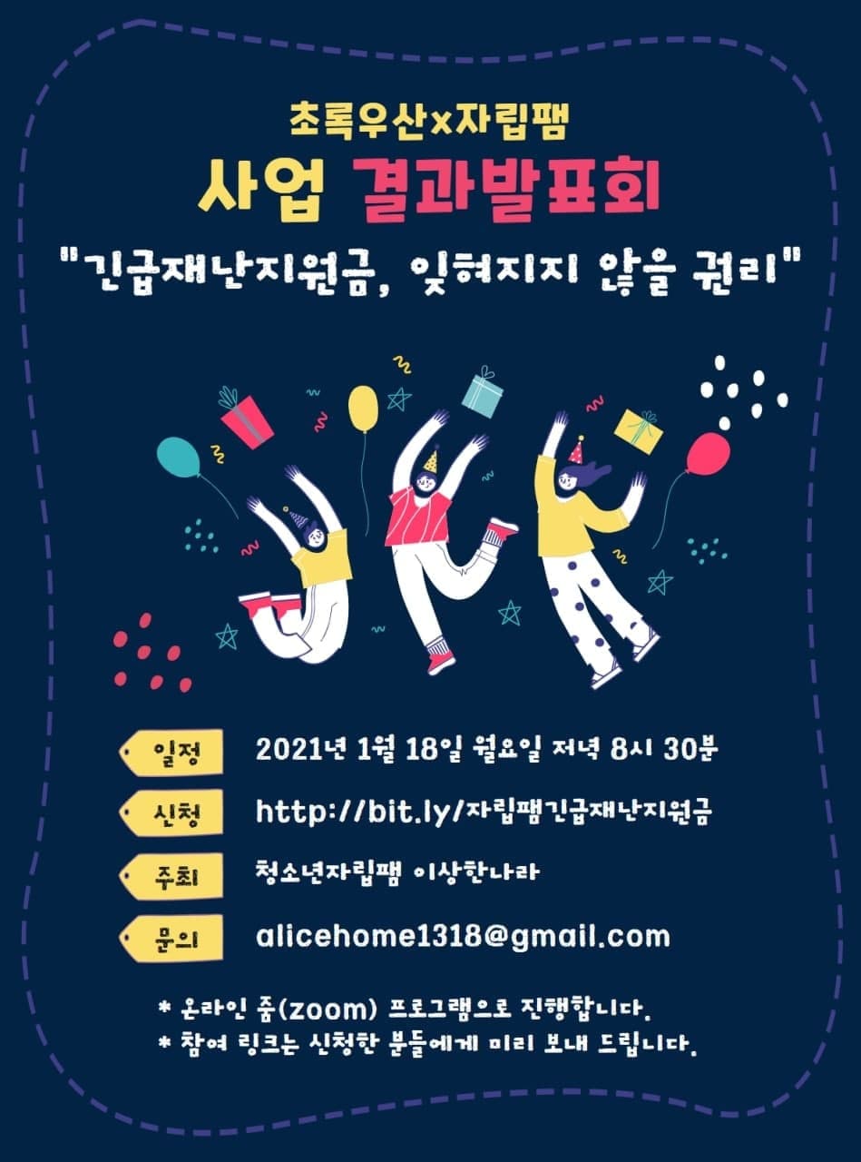 ![]() ▲ 초록우산 어린이재단 X 청소년자립팸 이상한나라 “재난을 견디는 평등+안전망: 탈가정 후기청소년 긴급재난지원금 지급 사업” 결과 발표회 안내 자료 중에서. ©청소년자립팸 이상한나라 |