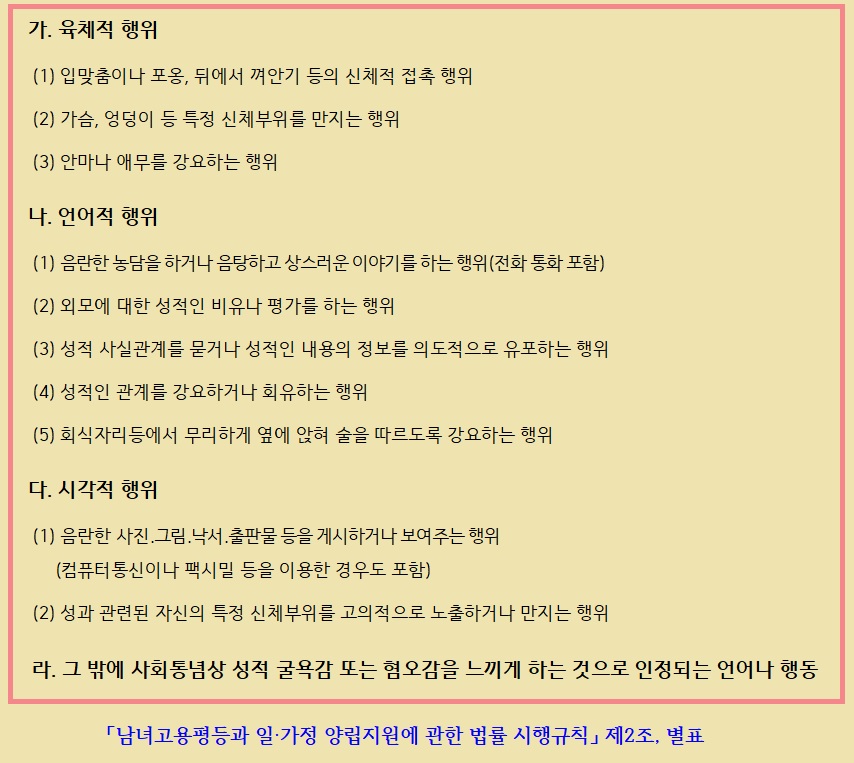 ![]() ▲ 「남녀고용평등과 일·가정 양립지원에 관한 법률 시행규칙」 제2조, 별표. 성적인 언동의 예시가 무엇인지 제시하고 있다. |