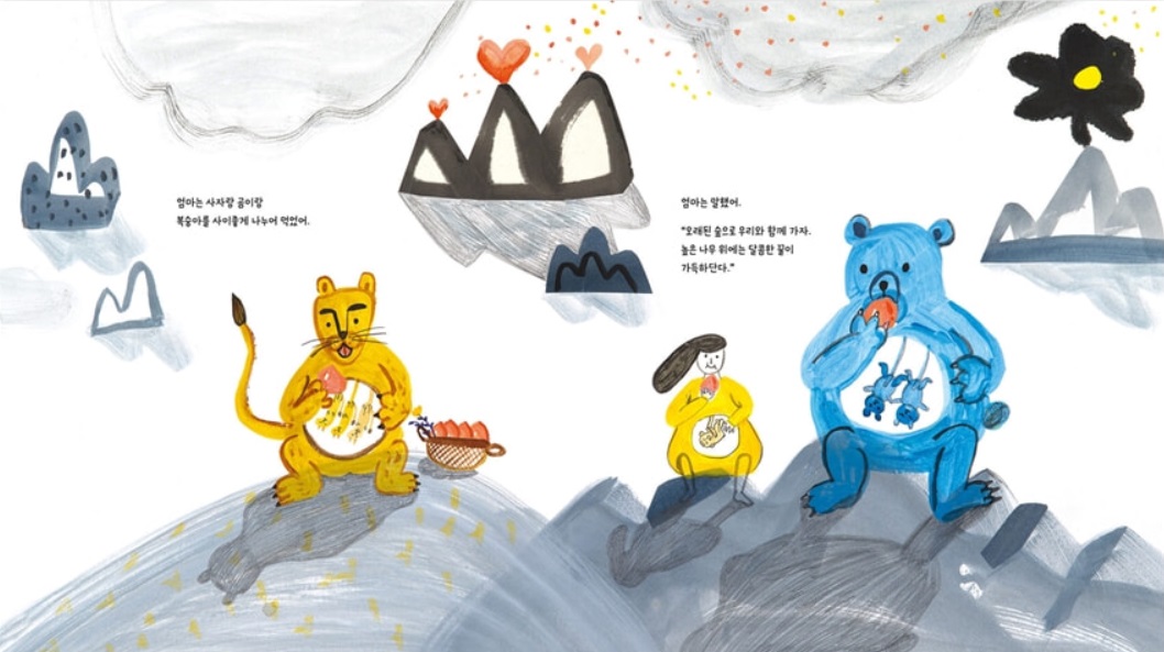 복숭아 하나 주면 안 잡아먹지, 식으로 전개되기 어려워 보이는 건, 사자도 배 속에 아기가 있어서 절박하기 때문이다. 태양도 삼키고 싶을 만큼 배가 고프다는 사자를 엄마도 공감할 수 있으니, 이 일을 어떡할까. 게다가 한 고비 넘기면 곰이, 또 한 고비 넘기면 거미가 나타나, 배가 고프니 잡아먹겠다고 아우성이다. 그들 모두 아기들의 엄마이니, 엄마는 정말 난감할 밖에.