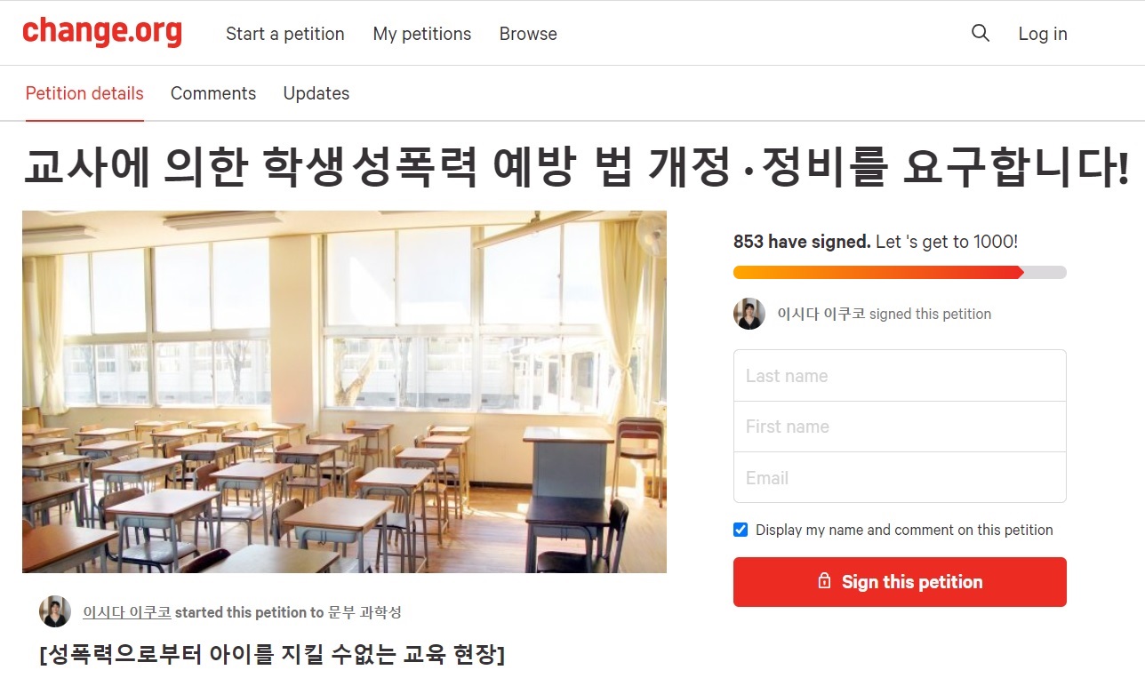 ![]() ▲ 이시다 이쿠코 씨가 교사에 의한 학생 성폭력 예방을 위한 제언에 관해 국제청원 사이트 체인지(Change.org)에서 서명을 받고 있다. http://chng.it/mqyc5qjHFb |