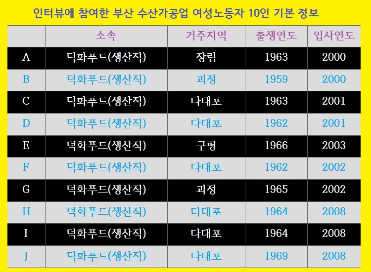 ![]() ▲ 인터뷰에 참여한 명란제조업체 덕화푸드 생산직 여성노동자 10명의 기본정보. 50대~60대 초반이고 경력은 10년~20년 정도다. |