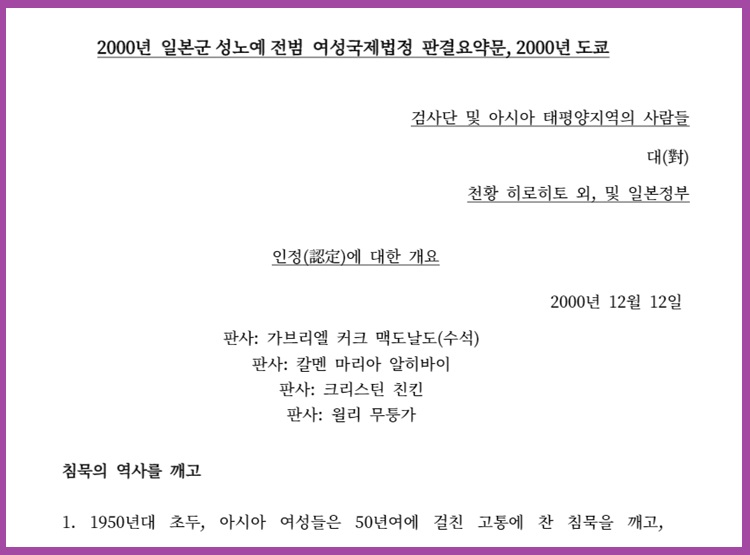![]() ▲ 2000년 일본군 성노예 전범 여성국제법정 판결요약문 중. (출처: 일본군‘위안부’문제 연구소 아카이브814 archive814.or.kr) |
