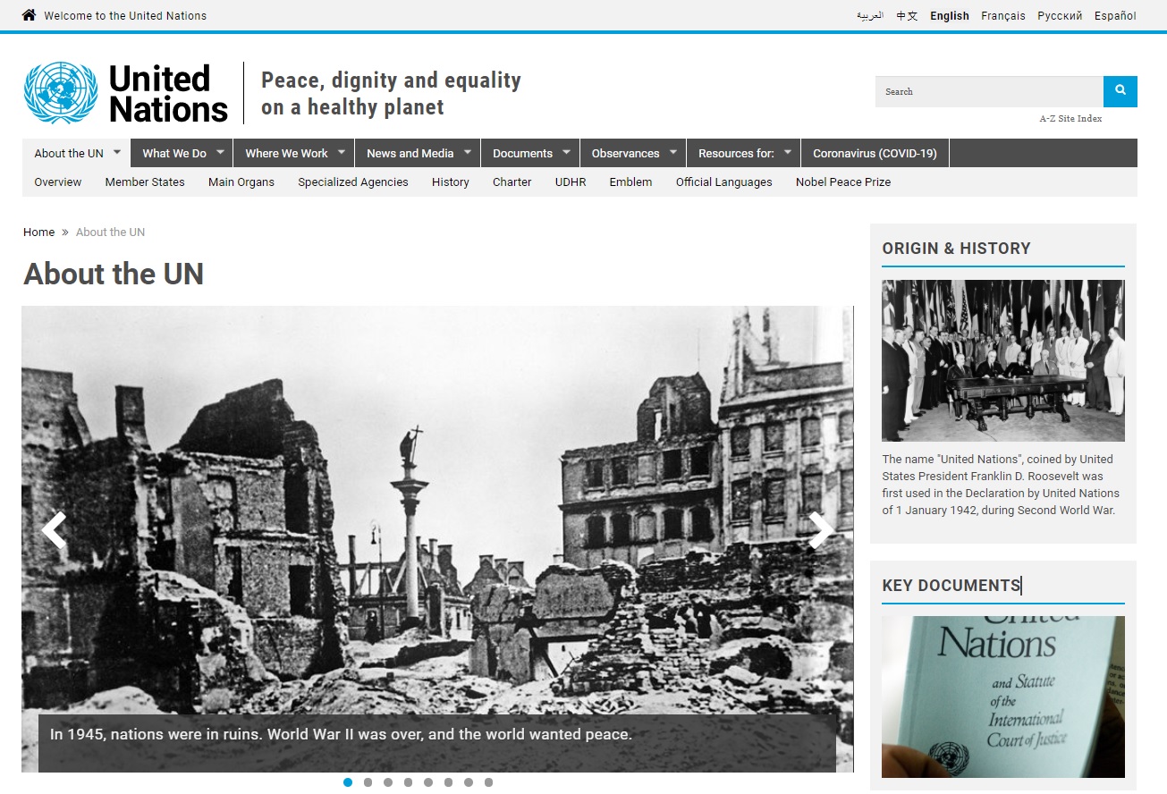 ![]() ▲ 유엔 홈페이지. 2차 세계대전 이후 전쟁을 방지하고 평화를 유지하기 위해 설립된 국제기구다. un.org |