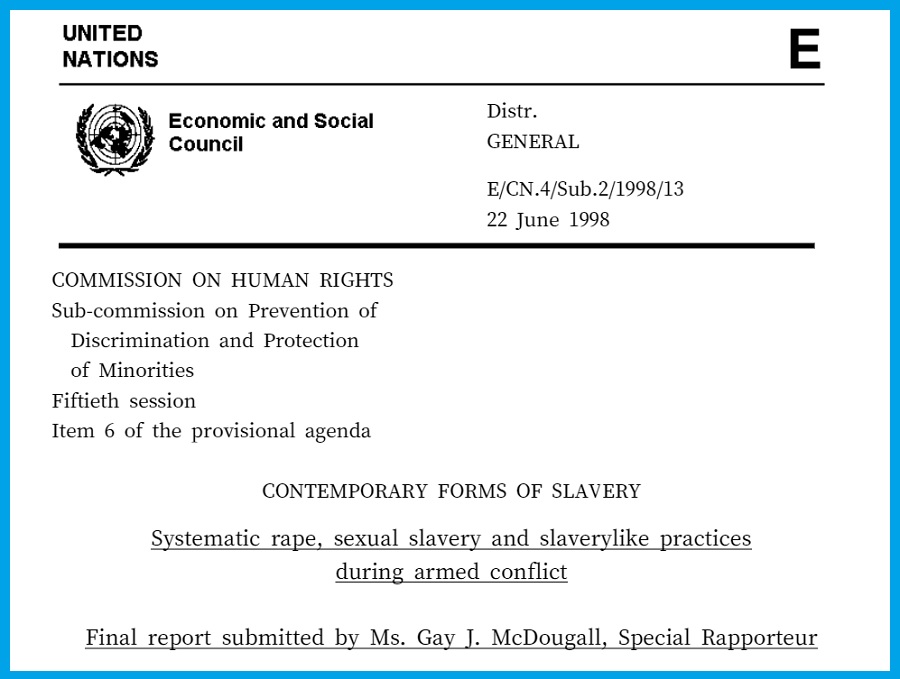 그리고 인권위원회 산하 인권소위원회의 특별보고관 맥두걸은 일본군‘위안부’ 제도에 대한 일본의 법적 책임을 권고하는 「무력충돌 중의 체계적 강간, 성노예제와 다름없는 관행」(1998)이라는 보고서를 제출한다. 이 유엔 보고서를 우리는 ‘맥두걸 보고서’라고 부르는 것이다.
