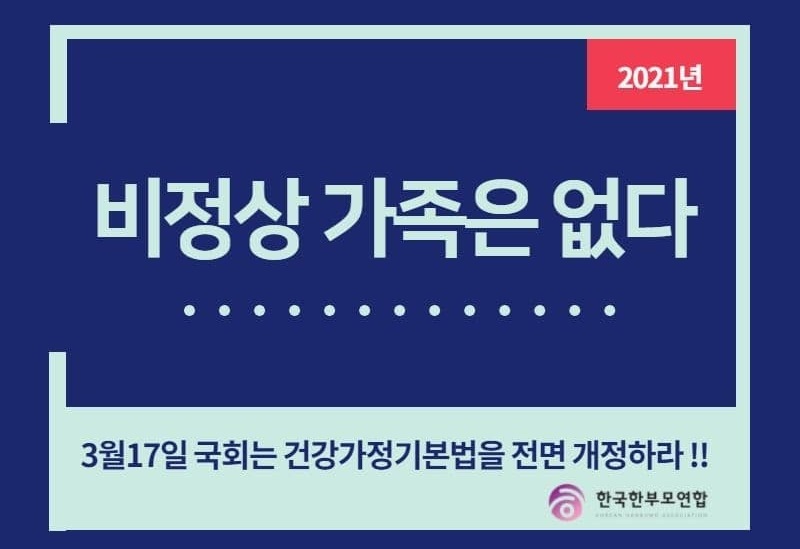 ![]() ▲ ‘건강가정’ 등의 분류를 통해 ‘정상성’ 규범을 강화하는 건강가정기본법의 전면 개정을 촉구하는, 한국한부모연합이 제작한 카드뉴스. “비정상 가족은 없다” |