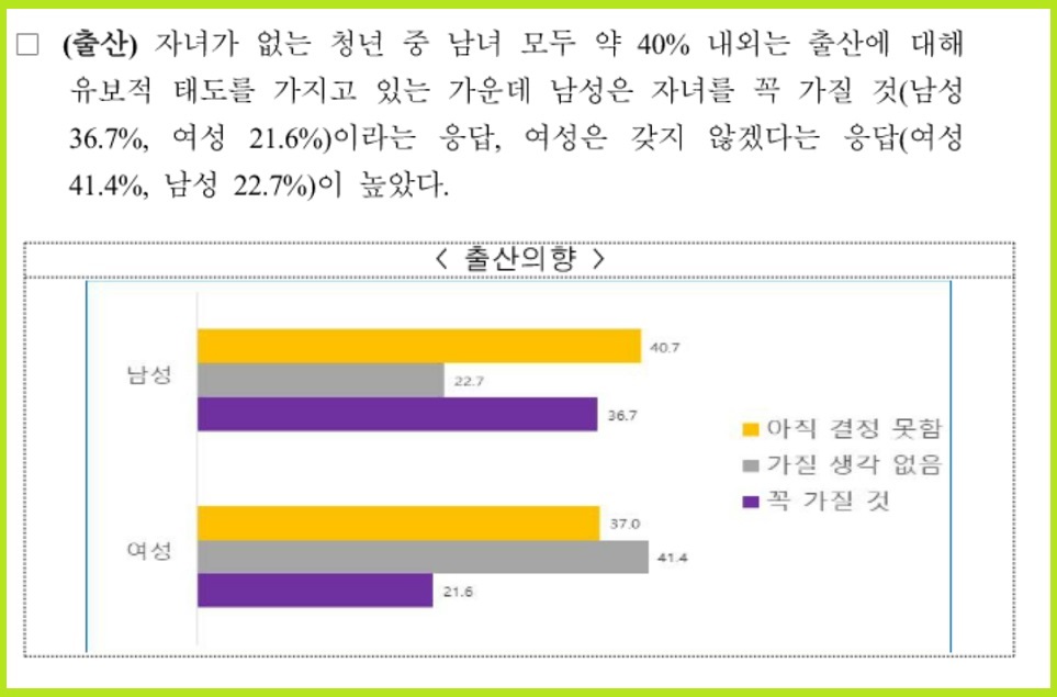 ![]() ▲ 여성가족부 "청년의 생애과정에 대한 성인지적 분석과 미래 전망 연구" 결과 보도자료 중 |