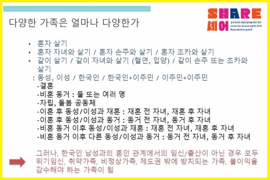 ![]() ▲ <‘가족다양성’을 넘어 차별과 불평등 해소를 위한 가족정책을 제안하며> 토론회에서 나영 ‘성적권리와 재생산정의를 위한 센터 셰어’ 대표의 발표 자료 중. |