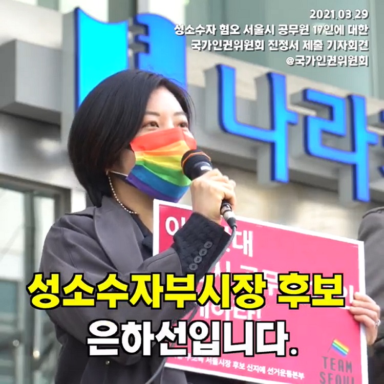 ![]() ▲ 3월 29일 ‘성소수자 혐오’ 서울시 공무원 17인에 대해 국가인권위원회에 진정서를 제출하는 기자회견에서, 팀서울 은하선 씨가 발언하고 있다. (출처: 무소속 신지예 서울시장후보 선거운동본부: 팀서울 페이스북) |
