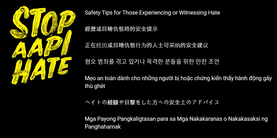 ![]() ▲ StopAAPIHate 사이트에서 ‘혐오범죄에 대한 안전 조언’을 안내하고 있다. (출처: https://stopaapihate.org) |