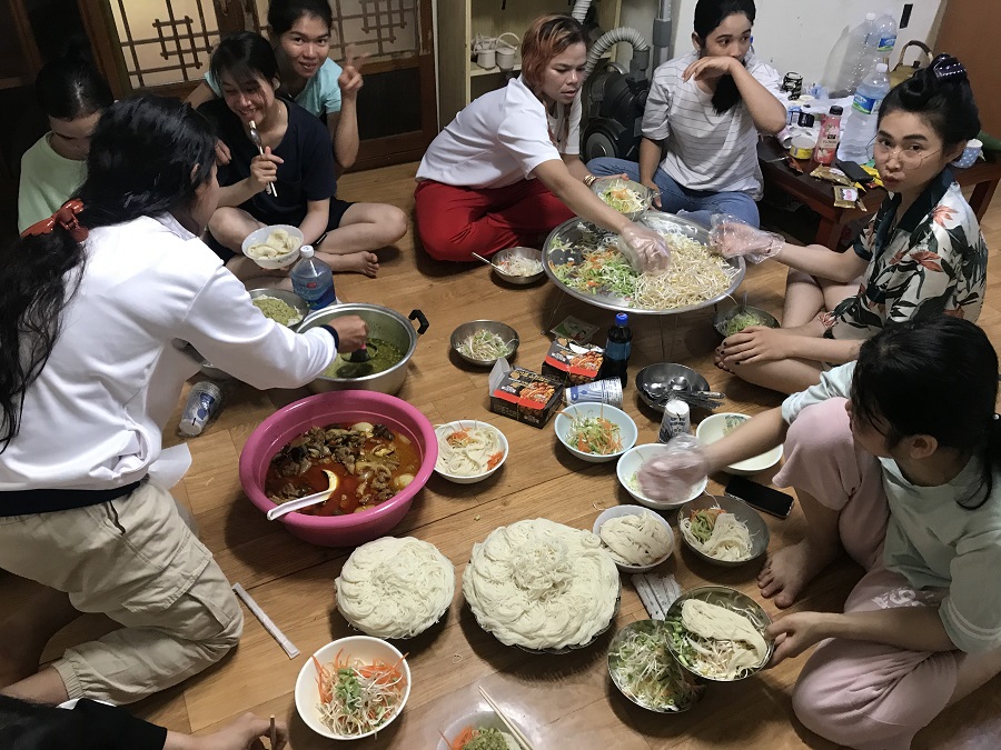 13. 가끔은 주변에 사는 캄보디아 노동자들이 모두 모여서 자신들의 고향음식을 같이 해먹습니다. 이주노동자들이 있는 곳이면 어김없이 “아시아 마트” 혹은 대형 마트 안에 “아시아음식” 코너가 생깁니다. 같이 음식을 먹으면서 타지 생활의 고단함을 달래기도 합니다. (5인 미만 집합금지 이전의 모습입니다.)