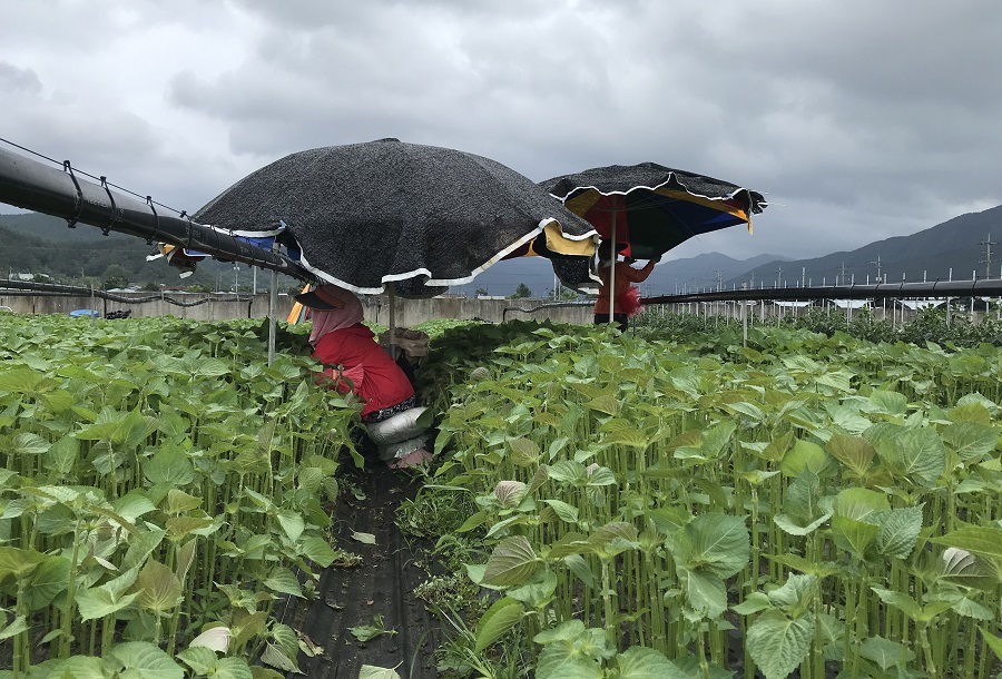 9. 비닐하우스 안에서 깻잎을 따기도 하고, 이렇게 노지에서 깻잎을 따기도 합니다. 비가 오는 날이면, 깻잎에 빗물에 멍이 들지 않도록 더 신중을 기해야 합니다. 깻잎의 상품가치가 떨어지면, 가격 또한 떨어지기 때문입니다.