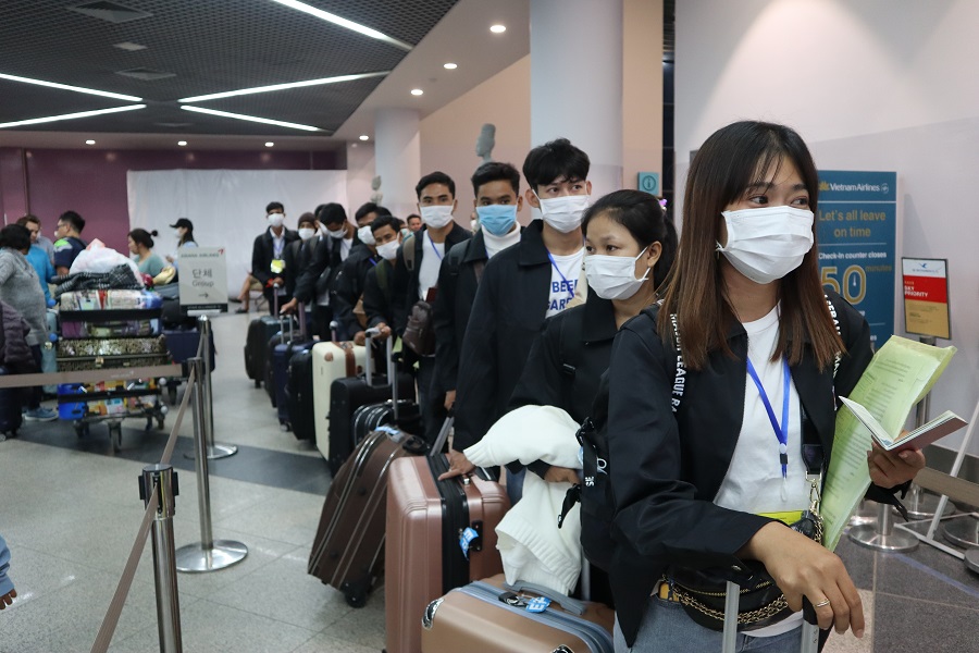 6. 프놈펜 국제공항 안의 모습입니다. 2020년 2월, 한국으로 떠나는 이주노동자들이 탑승수속을 위해 한 줄로 서있습니다. 검은 점퍼 앞 쪽에는 캄보디아 국기와 한국 국기가 조그맣게 붙어있고, 뒤에는 캄보디아어로 “캄보디아"라고 쓰여있습니다. 각각의 가방에는 각각의 사연과 꿈이 담겨있습니다.