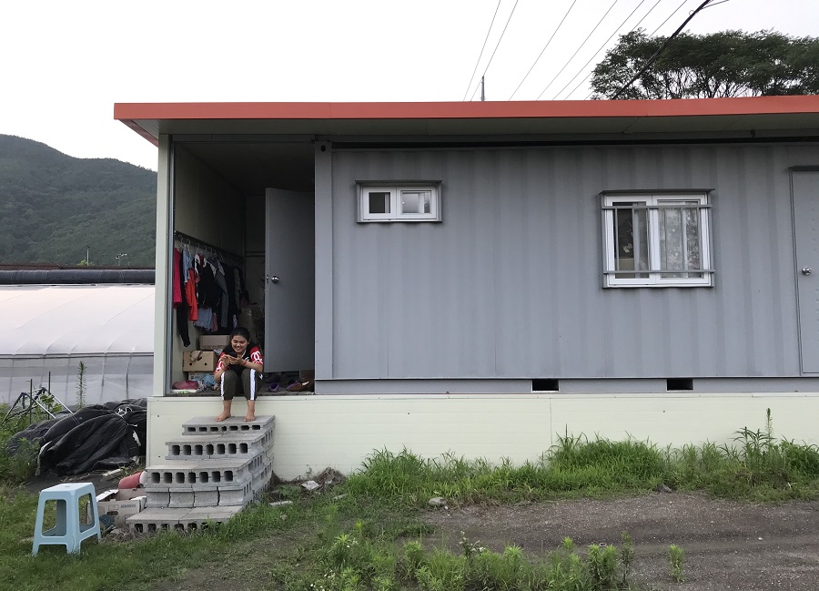 사진에는 담지 못했지만, 이 집 바로 앞에는 비닐하우스가 있습니다. 그 안에서는 사장님이 노동자들이 따온 깻잎을 상자에 담는 포장작업을 합니다. 이곳에는 하루 종일 에어컨이 돌아가고, 이 시원한 바람은 깻잎이 더위에 상품가치가 떨어지지 않도록 막아줍니다. 니몰(가명) 씨가 저에게 한 마디 했습니다. “사장님은 우리보다 깻잎을 더 사랑하나 봐요.”