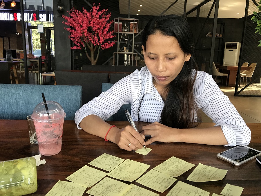 18. 쏘콤 씨가 자신의 삶의 여정을 쭉 적어보고 있습니다. 18살 때 프놈펜에 와서 거의 10년 동안 여러 공장을 전전하며 일했습니다. 그러다 2012년에 한국에 와서 4년 10개월 동안 전라도의 몇몇 농장에서 일했죠. 캄보디아에 돌아가서 한국어 특별 시험을 보고 다시 한국에 오려고, 겨울 옷과 이불을 사장님 집에 맡기고 왔습니다. 그러나 그 해에는 한국어 특별 시험 계획이 없었고 결국 한국으로 가지 못했습니다. 지금은 다시 프놈펜 외곽의 의류공장에서 일을 합니다.