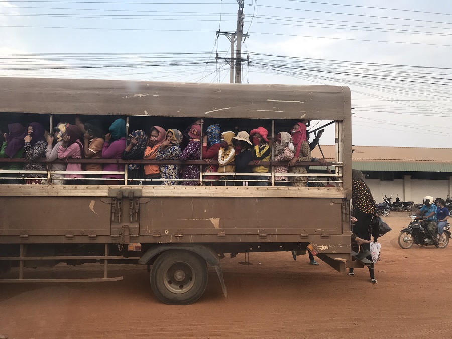 2. 프놈펜 외곽에서 볼 수 있는 흔한 퇴근 풍경입니다. 의류공장이나 신발공장에서 일이 끝나면, 노동자들은 이처럼 트럭에 타고서 퇴근을 합니다. 포장이 되어있지 않는 도로에서는 먼지가 날리기 때문에, 사람들은 이렇게 자신의 스카프로 얼굴을 가려 먼지를 막곤 합니다.