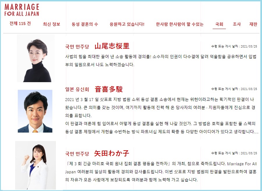 하지만, 일본 정부 및 여당인 자민당은 좀처럼 움직이지 않는다. 자민당 내에도 동성혼에 찬성하는 국회의원은 있지만, 삿포로 판결 후에 공명당이 동성혼 검토 워킹그룹을 꾸린 데 비해 자민당은 당 차원의 소극적 자세에 변화를 보이지 않고 있다.