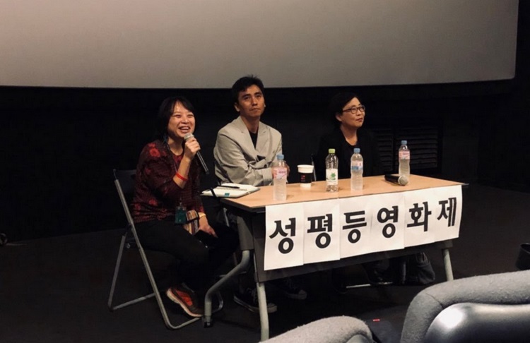 ![]() ▲ 중랑 지역 단체인 동북여성환경연대 초록상상에서 개최한 ‘성평등 영화제’에서 영화 <김복동>의 GV 진행을 맡은 상현.(가장 왼쪽) 출처: 인터뷰이 |