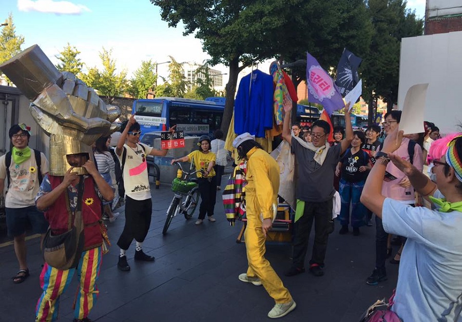‘이것저것 규탄대회’라는 이름으로 각자의 피켓과 깃발을 들고 서울 도심을 행진했어요. 원래 청와대까지 행진하려 했는데 가는 길에 지쳐서 도중에 돌아와 경복궁역 인근에서 대형 트럭에 밴드 세트를 싣고 공연을 했죠. 아현동, 문래동, 영등포 등지의 공연장, 예술공간을 연결해 공연하거나 세미나를 진행했어요. 성북구 희섬정과 같은 마을 카페 공간도 든든한 아지트가 되어주었어요.