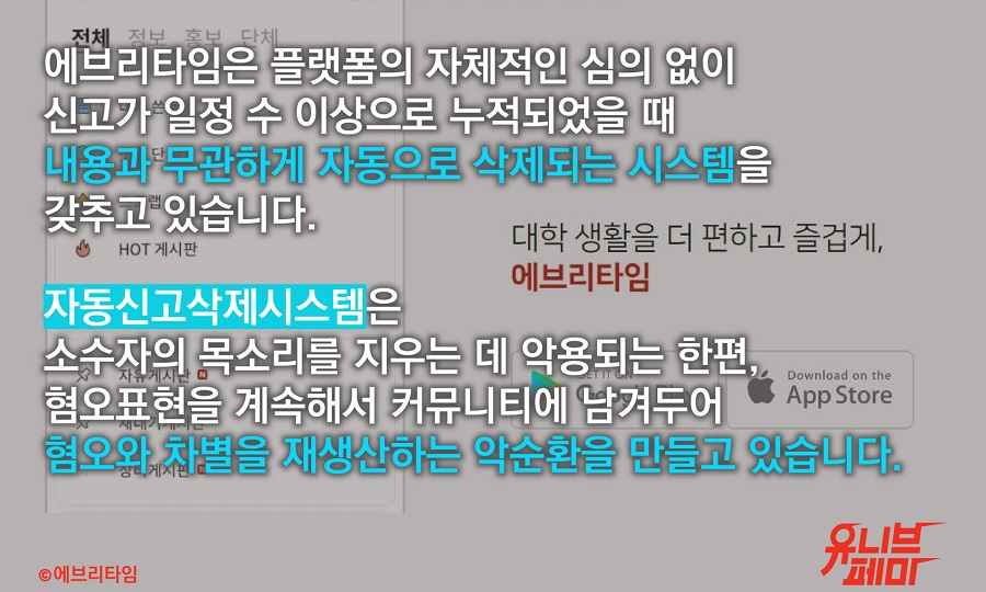 혐오 표현이 아니라, 혐오에 반대하는 이들이 플랫폼에서 축출되는 상식 밖의 일들이 발생하고 있는 것이다. 그 원인 중 하나는 에브리타임의 게시글 신고 시스템이다. 에브리타임은 특정 게시글에 대한 이용자들의 신고 횟수가 누적되면, 게시글의 내용과 상관없이 해당 게시글이 자동 삭제되도록 하는 게시물 관리 시스템을 운영하고 있다. 이러한 시스템은 다양한 의견과 입장을 가진 이용자들을 보호하기는커녕, 혐오에 반대하는 목소리를 내는 것 자체를 조직적으로 차단하는 수단이 되고 있었다.
