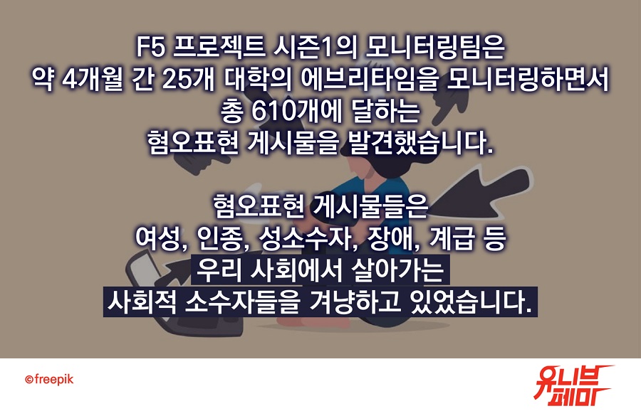 안타깝게도, 이는 이미 대학 온라인 커뮤니티에서 현실로 나타나고 있다. 대학 페미니스트 공동체 ‘유니브페미’가 <대학 온라인 혐오표현 대응을 위한 F5 프로젝트>를 출범시키며 “입장권 없는 사람들을 위하여”라는 슬로건을 내건 것은 이 때문이다.