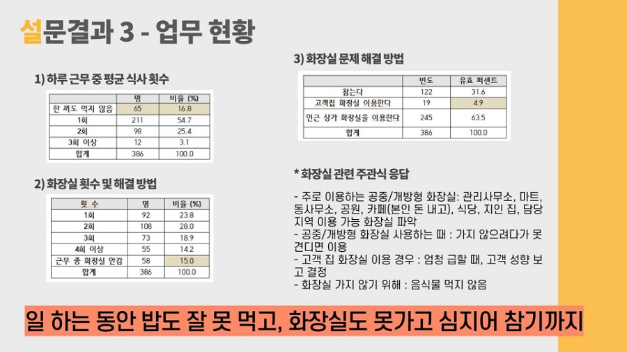 화장실 이용 문제도 심각했다. 화장실을 가지 않기 위해 “참는다”는 응답이 31.6%, “근무 중 화장실을 안 간다”는 응답이 15%였다. 계속 이동을 해야 하는 노동인데다, 이들의 노동 현장이라 할 수 있는 ‘고객의 집’은 편히 화장실을 사용할 수 있는 공간이 아니기 때문이다.