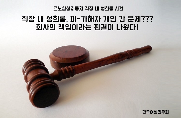 <주변에서는 “그래도 민사소송에서는 우리 측 주장이 모두 인용되고 형사소송도 회사에 최고 벌금형으로 종료되어 속시원하지 않냐”며 축하의 말씀을 하십니다. 그러나 회사의 괴롭힘에서 오히려 저를 보호해주는 방패막이 되었던 소송이 종료된 것이 저는 두렵기만 합니다. 회사가 또 어떻게 저를 괴롭히기 시작할지 모르기 때문입니다.> -‘르노삼성자동차 성희롱' 8년 만의 최종 판결 공동논평 중에서