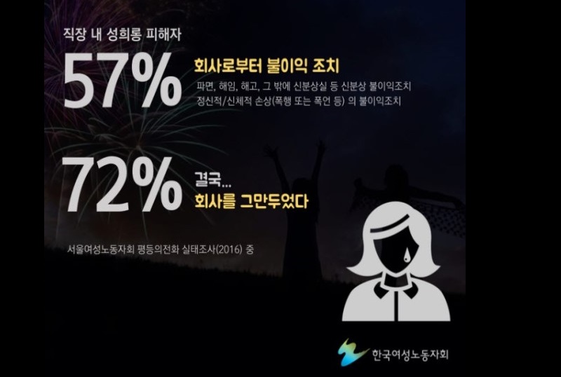 ![]() ▲ 2016년 한국여성노동자회 설문조사 결과, 직장 내 성희롱 피해자 중 56%가 회사로부터 불이익 조치를 받았다고 밝혔다. (출처 한국여성노동자회) |