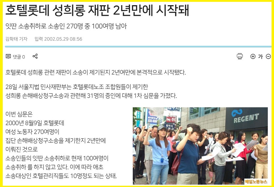 <서울지법 민사합의18부는 26일 롯데호텔 여직원 40명이 “회사 임직원에게 상습적으로 성희롱을 당했다”며 회사와 임직원 등을 상대로 낸 손해배상 청구소송에서 “피고들은 원고 19명에게 모두 2900만원을 지급하라”며 원고 일부승소 판결하고, 원고 21명에 대해선 청구를 기각했다.> (국민일보, 「직장性희롱 회사도 일부 책임" 롯데호텔 여직원 19명에 2900만원 손배판결」, 2002년 11월 26일)