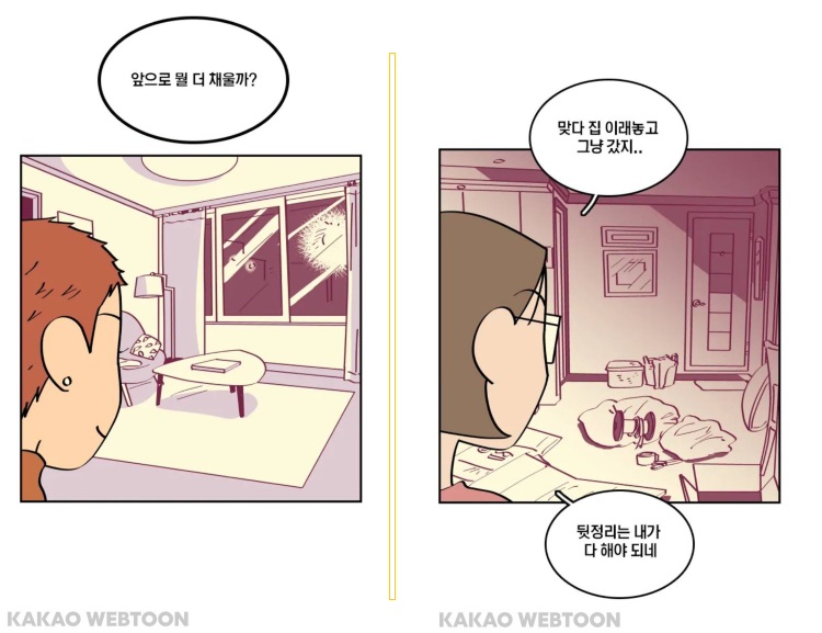 ![]() ▲ “앞으로 뭘 더 채울까?” / “맞다 집 이래놓고 그냥 갔지... 뒷정리는 내가 다 해야 되네” 『남남』 38화 이사 中 |