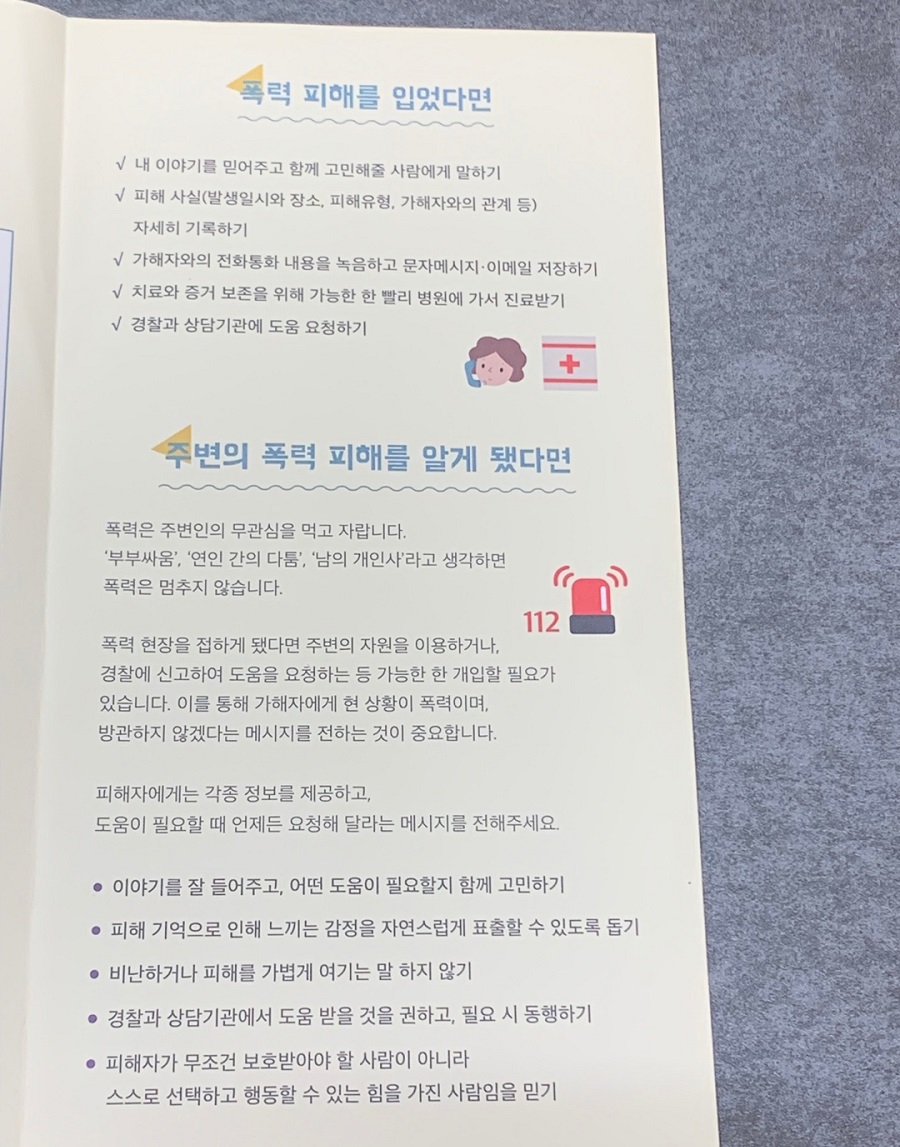 ▲ 한국여성의전화에서 만든 <폭력과 차별에 침묵하지 않는 당신께 드리는 안내서> 팜플렛. 폭력 피해를 입은 당사자이거나 주변인으로서의 행동 및 태도를 짚어주고 있다.