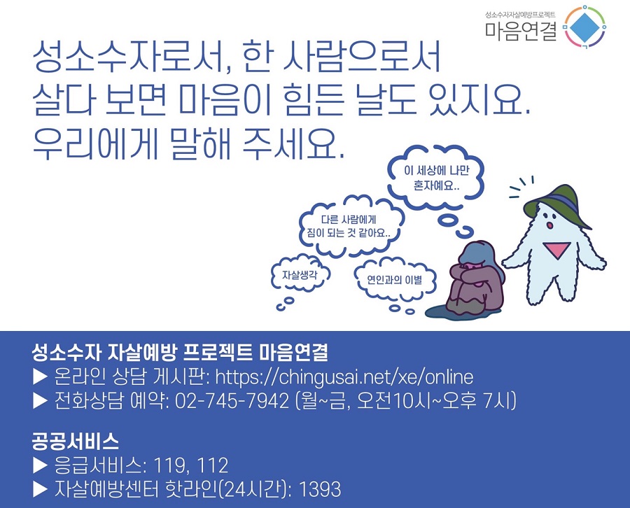 ▲ 성소수자자살예방프로젝트 마음연결 홍보 이미지. “마음연결이 성소수자 자살예방을 위한 전화상담을 운영합니다. 자살을 생각하며 고민하고 있는 성소수자들은 주저하지 말고 전화상담을 이용해 주세요.”