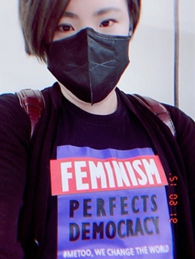 ▲ 올해 3.8세계여성의날에 "FEMINISM PERFECTS DEMOCRACY, #METOO, WE CHANGE THE WORLD"(페미니즘이 민주주의를 완성한다. 미투, 우리는 세상을 바꾼다)라고 적힌 후원 티셔츠를 입고 사진을 찍었다.