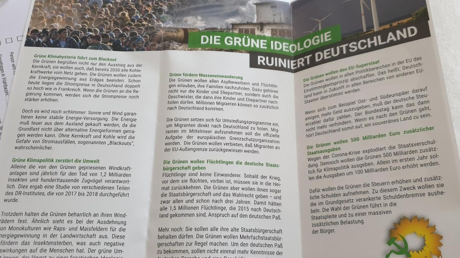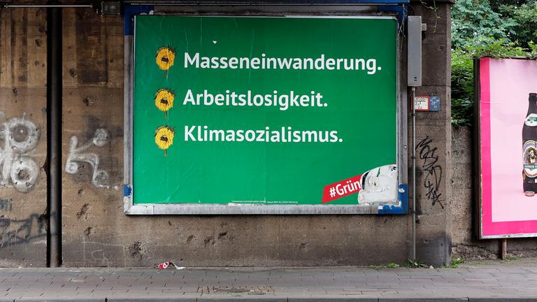 ![]() ▲ 녹색당의 상징인 해바라기가 시든 이미지를 이용해 녹색당의 주요 공약인 “친난민/이주정책, 사회복지 확대, 기후보호”를 “대규모 이주, 실업, 기후사회주의"라고 폄하하는 대형 간판. 극우정당인 독일을위한대안(AfD)은 반녹색당 캠페인과 관련이 없다고 강조했지만, 배후임을 알리는 여러 정황이 드러났고 반녹색당 캠페인 내용에 대해서도 동의한다는 입장을 밝혔다. (출처: Imago) |