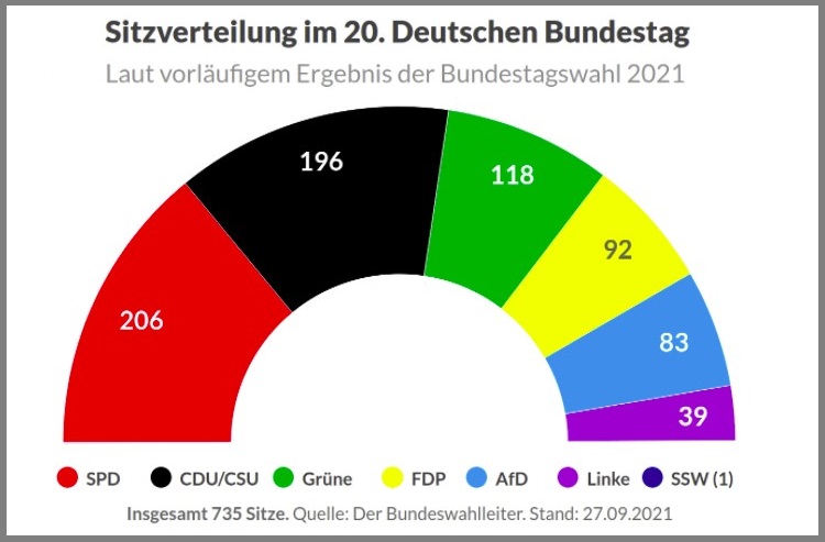 ![]() ▲ 총선 결과에 따른 정당별 의석 배분. 사회민주당, 기독민주당/기독사회당 연합, 녹색당, 사회민주당, 독일을위한대안, 좌파당 순. (출처: 연방선거관리위원회) |