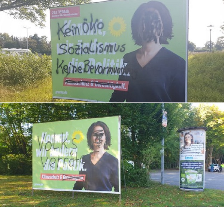 ![]() ▲ 아날레나 베르보크 총리 후보 사진이 걸린 녹색당 포스터를 훼손하고 ‘No 생태사회주의, No 베르보크’, ‘민족의 반역자’ 등의 문구로 혐오와 반대를 드러냈다. (출처: Maya Graef, Doris Grove-Mittwede) |