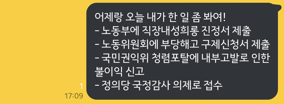 둘째, 고용노동부에도 진정을 넣었다. 회사는 직장 내 성희롱 사건을 조사하지 않았으며, 가해자를 해고했다고 거짓말했다. 성폭력 예방교육은 창업 이래 단 한 번도 시행하지 않았다. 그런데, 노동부 진정은 쉽지 않았다. 3시간 진술하였음에도 내 조서는 A4용지 단 한 장이었으며 직장 내 성희롱은 언급조차 없었다. 근로감독관은 내게 끊임없는 위로를 건넸다. 이 조서에도 내가 겪은 일이 적히지 않는다면, 그 어디에도 남을 수가 없는 상황이었다. 신체접촉이 없는 성희롱은 경찰에 신고할 수 없기 때문이다.