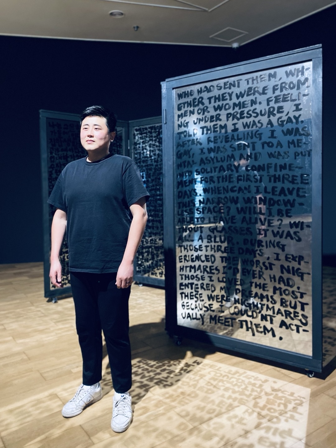 “(관객들과 만난다는 건) 긴장되는 일이죠. 사실 시험대에 오른 기분이었어요. 이 작품이 사람들에게 어떻게 다가갈 지는 제가 예측할 수 없는 부분이니까요. 특히 타인의 이야기를 가져온 것도 있기 때문에, 이야기가 왜곡되지 않아야 한다는 책임감도 있었고요. 서울에서 전시했을 땐 매일매일 전시장을 지켰는데, 관객들과 이야기를 나누면서 제가 배우기도 했어요. 어떤 분이 ‘이제 이 일에 제가 연류되었네요’라고 했는데 그 말이 계속 맴돌더라고요. 내가 관객들을 초대해서 이 일(군대 내 동성애자 차별과 폭력)의 목격자로 연류시켰다는 것. 그리고 전시장에 있다 보면 하루에 한두번씩, 저한테 와서 자신이 겪은 어려웠던 일들을 털어놓으며 울고 가는 분들이 있었어요. 그럴 수 있었던 건, 이 전시 공간이 안전하다고 느끼셨다는 거겠죠.”