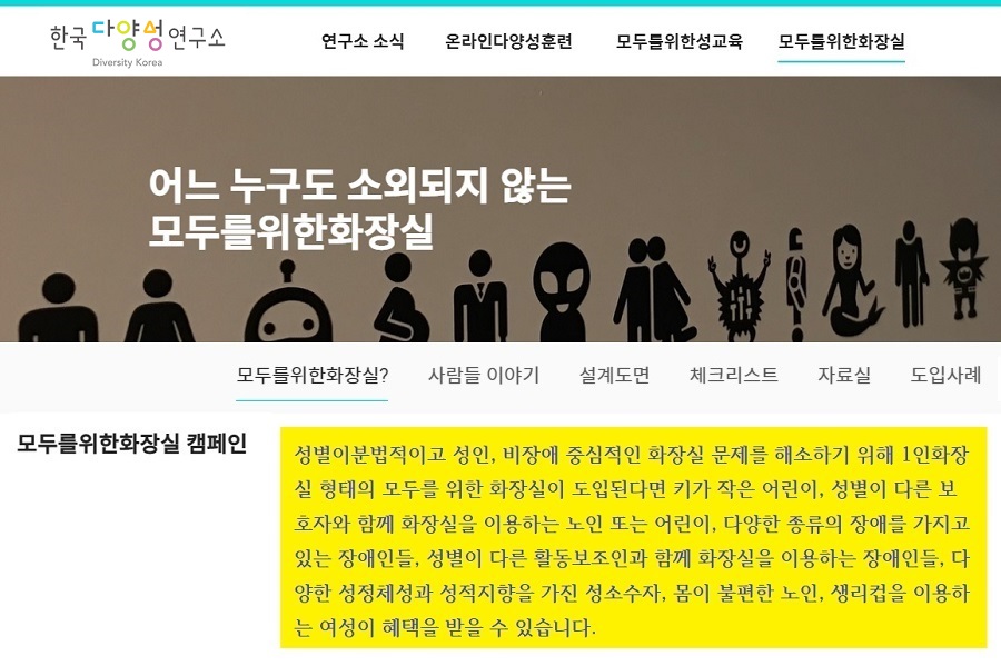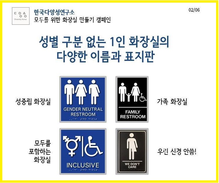 ![]() ▲ 한국다양성연구소에서 진행하는 ‘모두를 위한 화장실 만들기 캠페인’ 자료 중. (출처: 한국다양성연구소) |