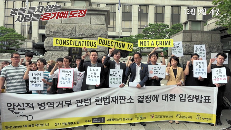 약 20년의 병역거부운동 이야기를 담아낸 영화 <총을 들지 않는 사람들: 금기에 도전>을 보면 시기적으로 조금 빈 부분이 있다는 걸 알게 된다. 이명박, 박근혜 정부를 거치는 동안 병역거부운동은 앞으로 나아가기 힘든 암울한 시간을 보냈다. 노무현 정부 말기였던 2007년 9월, 국방부는 ‘양심적 병역거부 대체복무 허용’에 관해 발표하며 빠르면 2009년부터 시행할 계획이라 했지만, 이명박 정부가 들어선 후 ‘국민적 합의’가 필요하다며 대체복무제를 철회해버렸다. 병역거부운동은 큰 타격을 받았다.