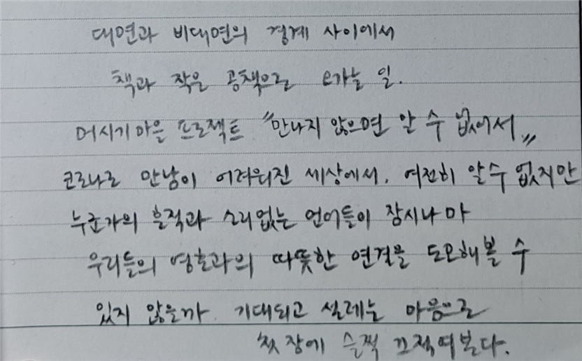 책 릴레이를 진행하며 “굳이 그렇게 만나야 해?”라는 질문을 많이 들었다. SNS에서 서로를 태그하거나 온라인 플랫폼에서 프로그램을 진행하는 등 보다 효율적이고 눈에 띄는 방법이 있었다. 책 보따리를 우편으로 교환하는 만남은 배송 사고나 분실의 위험도 있고, 배송료나 배송 시간 등의 여러 비용도 발생했다. 그럼에도 책 릴레이를 선택한 이유는 직접 만나기 위해 기꺼이 해오던 수고로움이 그리웠기 때문이다. 만나기 위해 시간을 잡고 길을 찾는 것처럼, 우린 제각기 다른 글씨체와 문장들 속에서 타인과 만나려 애썼고, 나와 같은 문장에 밑줄을 그은 누군가의 흔적에 공감과 위로를 받았다. 그렇게 약 4개월 동안 책에 묻은 흔적과 공책에 적힌 편지로 스무 명의 사람들을 만났다.