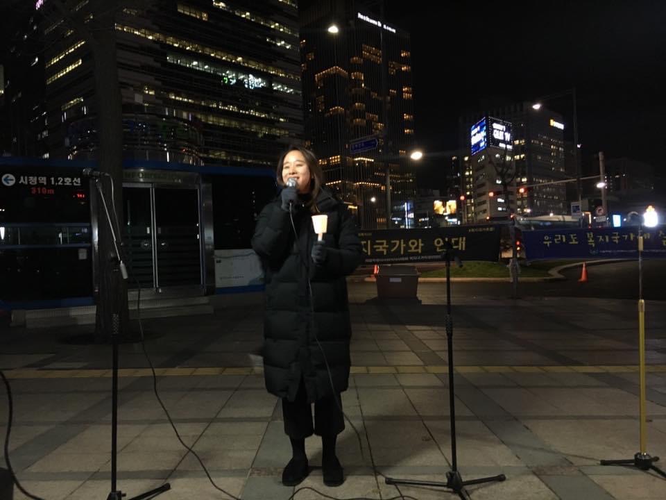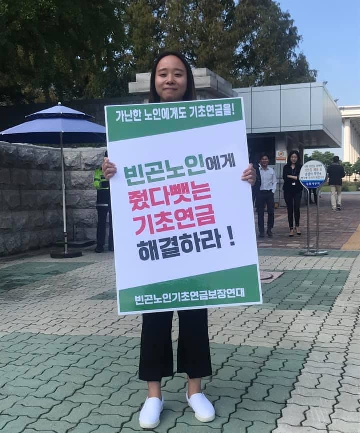 ![]() ▲ 기초연금 문제와 관련해서 국회 앞에서 1인시위 하는 필자의 모습. (출처: 김혜미) |