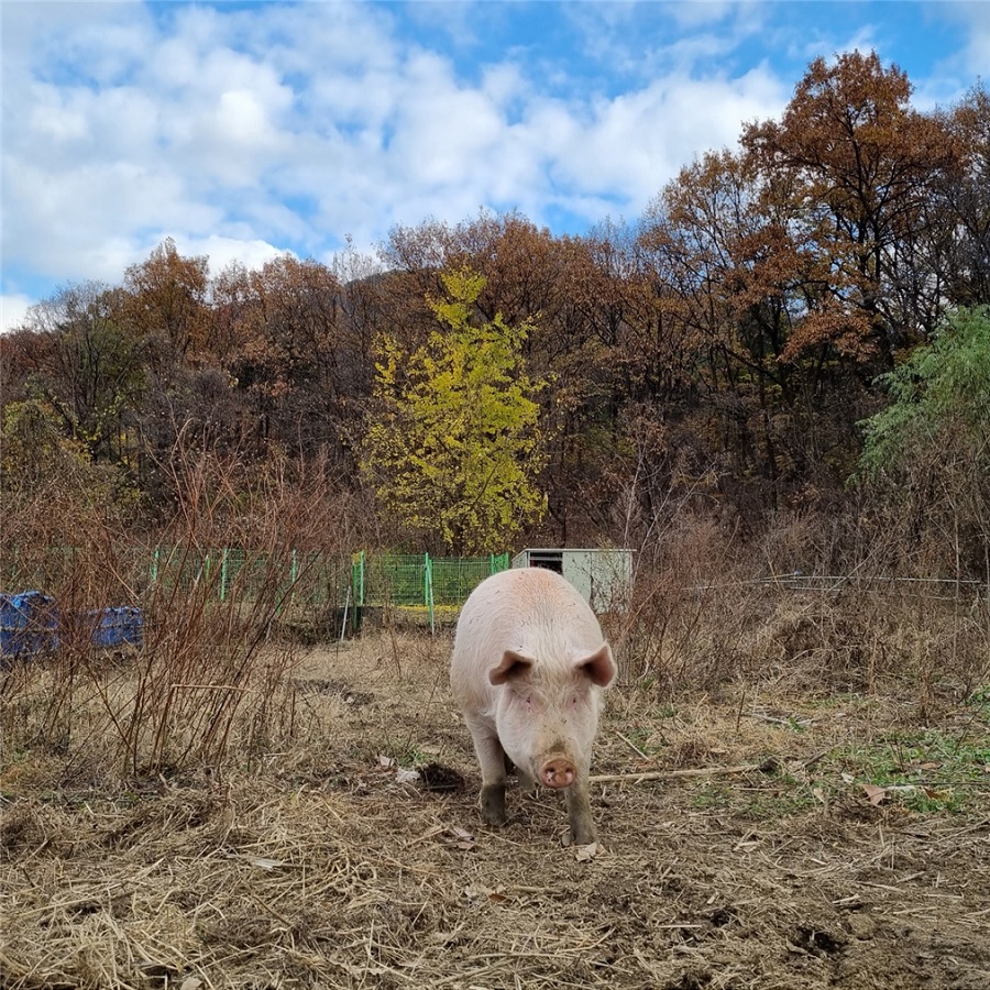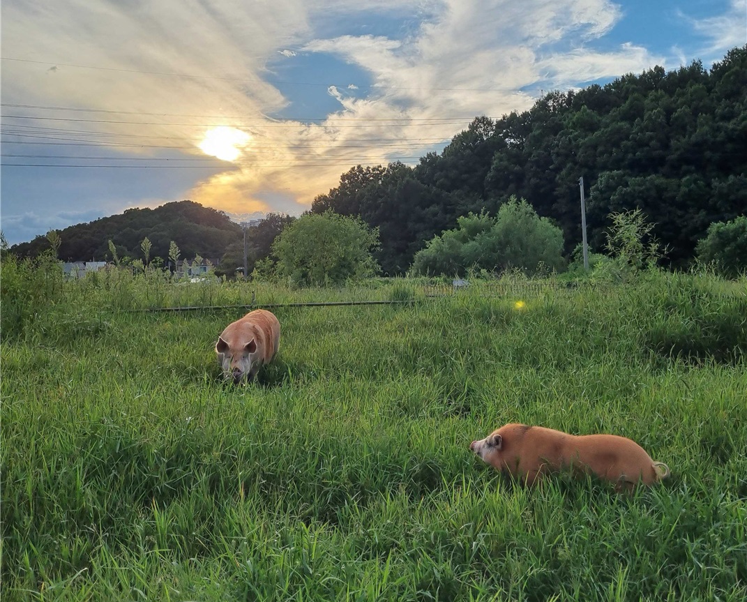 활동하는 두 시간 동안 인간 세상과 철저히 단절된 고요를 느꼈다. 우거진 숲과 너른 들판, 해가 넘어가는 게 막힘없이 보이는 탁 트인 하늘. 그 안에 돼지들이 있었다. 돈가스로, 보쌈으로, 햄으로, 족발로만 만났던 돼지들이 각자의 공간에서 자신답게 살아 숨 쉬고 있었다. 새벽이는 새벽이의 속도대로 부지런히 밥을 해치우고 느릿느릿 걷거나 하늘을 바라봤다. 잔디 또한 잔디의 속도대로 천천히 밥을 먹다가 돌아다니다가 또다시 밥을 먹으러 왔다.