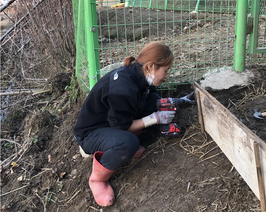 생추어리를 몇 차례 다녀오며 기본적인 돌봄을 비롯해 여러 활동을 했다. 추운 겨울 밤새 내린 비에 땅이 질척여 새벽이의 발이 푹푹 빠지던 날이었다. 어느 곳은 깊은 진흙이 되어있었고 또 다른 곳은 미끄럽게 꽝꽝 얼어붙어 있었다. 얼음과 물을 걷어내 최대한 새벽이가 안전히 다닐 수 있도록 흙을 일구었다. 잠을 자는 방으로 가는 경사면 또한 너무 미끄러웠다. 계단을 만들어 주기로 했다. 나영과 웅이 나무판자를 잘라 계단의 틀을 세우면 나와 다솜은 부드러운 흙을 모아 채웠다.