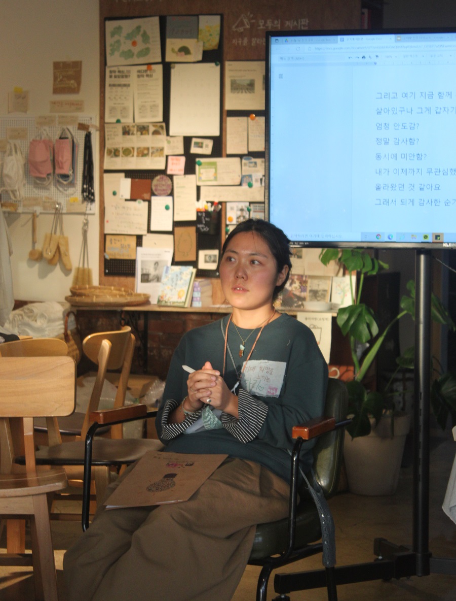 다른 친구들도 이야기를 이어갔고 원래 마치기로 한 시간이 훌쩍 다가왔어. 각자 준비해 온 선물을 나누고 카페 이공 공간을 정리했어. 곧 예약한 열차 시간이 다가오는 친구들은 아쉬워하며 서로 인스타 아이디를 주고받았어. 포옹하고 인사를 나눴던 참가자 보말은 이런 후기를 남겨줬어.