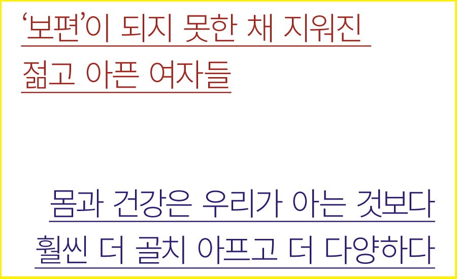 젊고 아픈 여성들이 겪는 차별과 무시, 배제와 혐오는 놀라울 정도로 다양하고 사회 곳곳에 자리하고 있음을 이 책은 밝히고 있다. 저자의 말대로 “젊은 여성이 의학적인 어떤 문제를 안고 살아간다는 것은 세상의 기대를 정면으로 거스르는 일”이다. 여전히 세상은 “젊은 여성들에게 반짝이는 청춘의 화사한 불빛이 되어야 한다”고 말하기 때문이다.