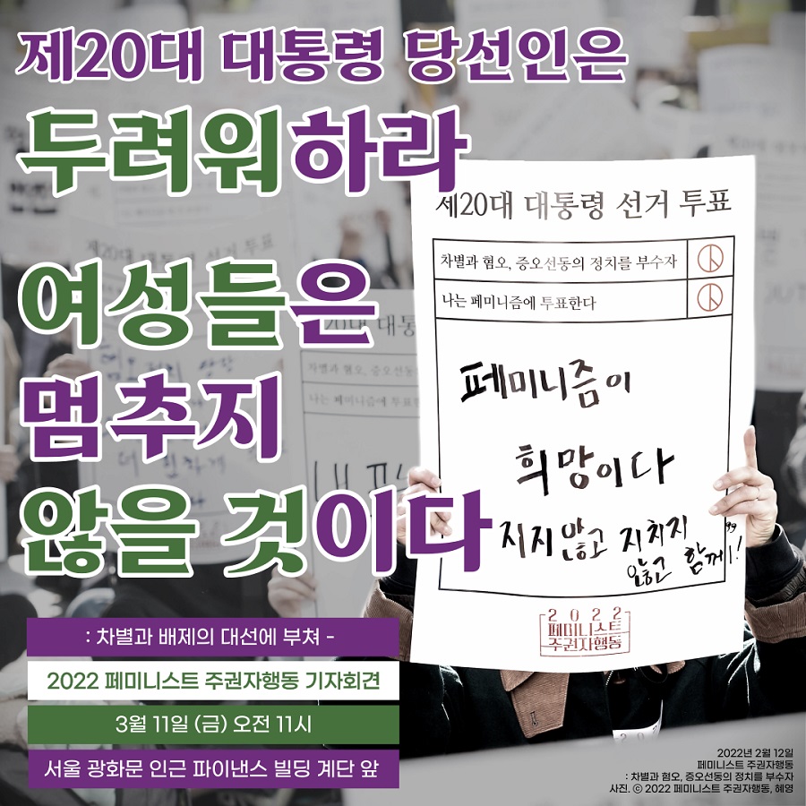 혐오 선동으로 얼룩진 제20대 대통령 선거의 결과가 나왔고, 많은 페미니스트들은 절망했지만 다시금 신발끈을 동여매고 힘차게 달릴 준비를 하고 있다. 선거가 끝나고 이틀 뒤, 2022 페미니스트 주권자행동은 <제20대 대통령 당선인은 두려워하라. 여성들은 멈추지 않을 것이다>라는 기자회견을 열고 결의를 다졌다. 차별금지법제정연대는 여전히 멈춰있는 차별금지법 제정을 위해 목소리를 높이며 <차별을 끊고 평등을 잇는 2022인 릴레이 단식행동>을 시작했다.
