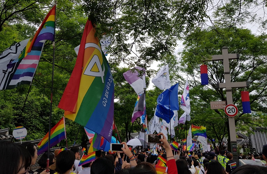 가장 부아가 났던 건, 서울광장에서 축제에 참여할 때 우리는 계속 갇혀 있어야 한다는 거였다. 홍대입구에서 할 때까지만 해도 그렇진 않았는데(그때는 퍼레이드 때 혐오자들이 스크럼을 짜고 드러누워서 진행이 n시간 연장되긴 했다), 어느 순간부터 우리는 갇혀서 축제를 진행해야 했다. 광장을 둘러싸고 철책을 치고, 그 안에서 부스를 차리고 왔다 갔다 했던 시간들. 몇만 명의 사람이 더운 날씨에 그 안에서 오가고 있을 때, 철책 너머에서는 혐오자들이 부채춤을 추고 트럭에서 거짓 선동을 하고 어린이를 앞세워 타인의 존재를 부정하며 소리 지르고 있었다. 나는 축제에 가는 게 기쁘면서도, 안과 밖을 가로지르는 ‘경계’를 바라볼 수밖에 없는 순간마다 무언가 내려앉는 기분이 들곤 했다.