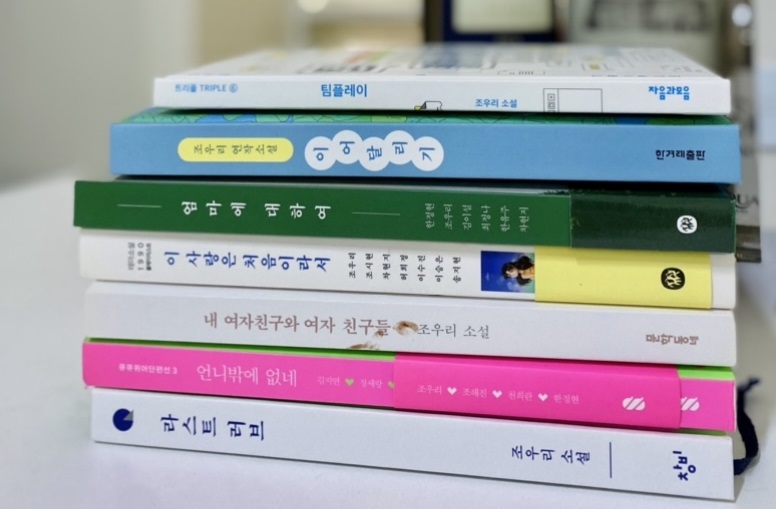 ![]() ▲ 조우리 작가의 책들. <라스트 러브>(창비 2019), <언니밖에 없네>(공저, 큐큐QQ 2020), <내 여자친구와 여자 친구들>(문학동네 2020), <이 사랑은 처음이라서>(공저, 다산북스 2020), <엄마에 대하여>(공저, 다산북스 2021), <이어달리기>(한겨레출판사 2022) <팀플레이>(자음과모음 2021) ©일다 |
