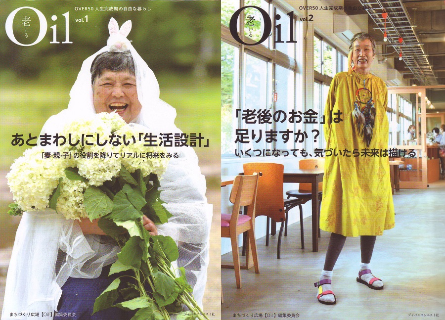 (※지카야마 씨가 편집장을 맡고 사사키 씨, 구시비키 씨가 편집하는 ‘50세 이상 인생 완성기의 자유로운 삶’을 위한 잡지 『Oil』(老いる, 오이루, 나이든다는 뜻, 재팬머시니스트사, 각 1,300엔)이 작년 9월에 창간되었다. 1호는 「나중으로 미루지 않는 ‘생활설계’, 아내, 부모, 자녀의 역할에서 내려와 리얼하게 미래를 보다」, 2호는 「‘노후의 돈’ 충분한가? 몇 살이든 이런 생각이 든다면 미래를 그릴 수 있다」를 표제로 다루었다.)
